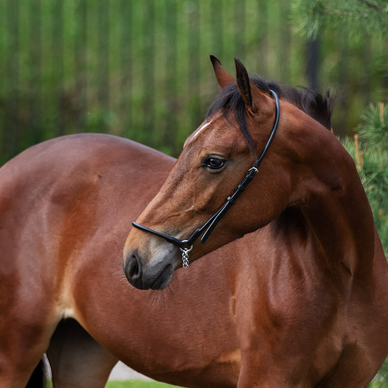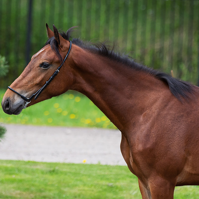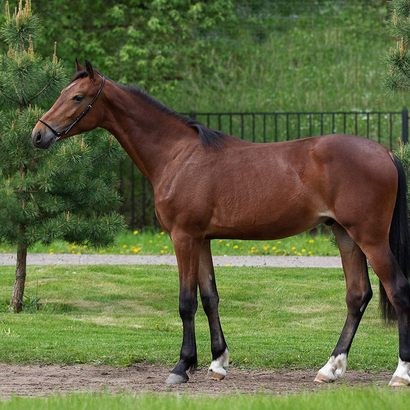 Легкий жеребчик на высоких ногах с длинной шеей, с хорошей работой задних ног. Уже сейчас обладает неплохим импульсом.